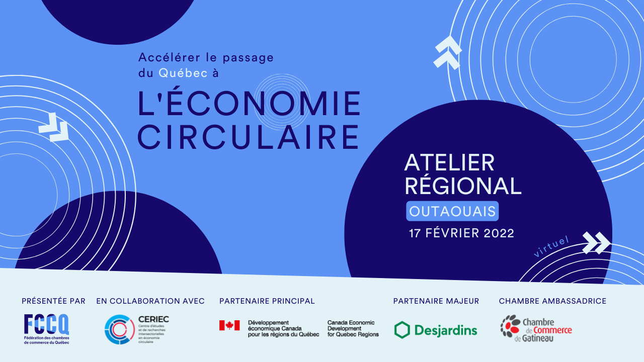 La Chambre de commerce de Gatineau (CCG), en collaboration avec la Chambre de commerce de Maniwaki et de la Vallée-de-la-Gatineau et de la Chambre de commerce Vallée de la Petite-Nation, est heureuse de vous convier à la Tournée sur l’économie circulaire, une initiative à l’échelle provinciale. Vous êtes invités à participer à une série de deux ateliers pour découvrir le concept de l’économie circulaire, ses avantages et les outils et stratégies à votre disposition pour l’intégrer au sein de votre entreprise.