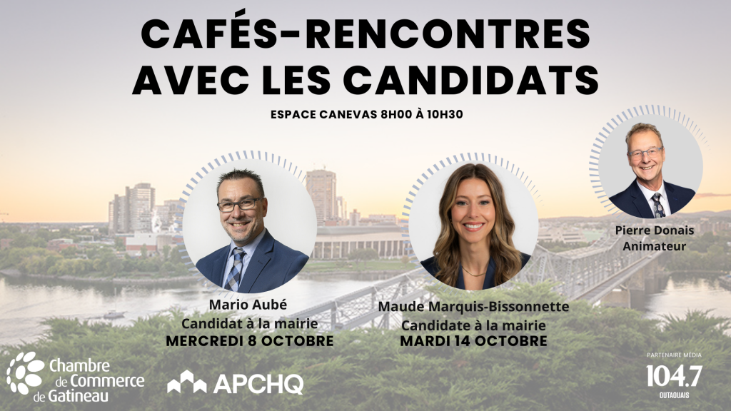 Afin de favoriser le dialogue entre la communauté d’affaires et les candidat(e)s à la mairie, la CCG, en collaboration avec l’APCHQ et le 104,7 Outaouais, vous invite à deux cafés-rencontres avec les candidat(e)s.