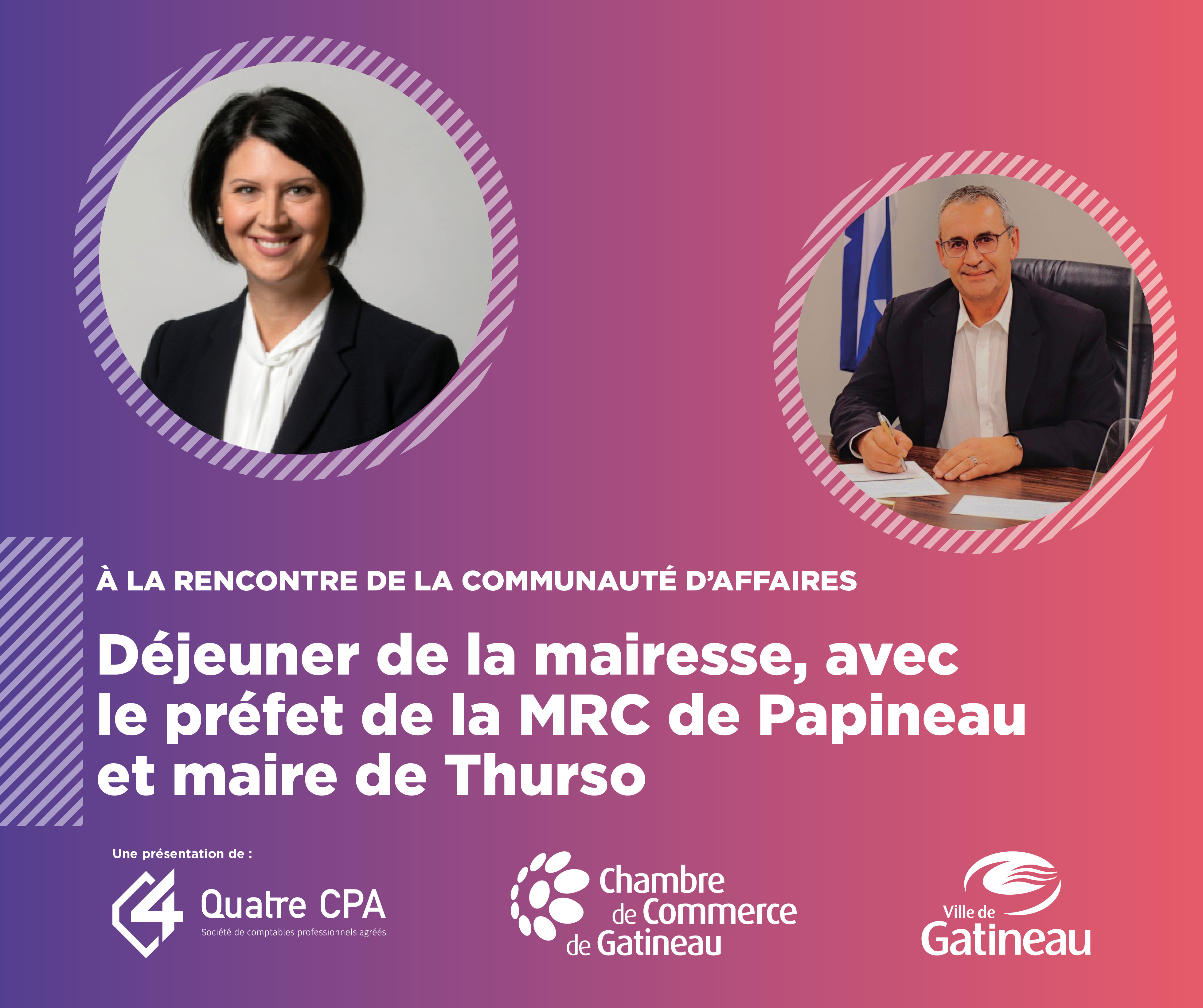 Venez rencontrer France Bélisle, mairesse de Gatineau, et Benoît Lauzon, préfet de la MRC de Papineau et maire de Thurso, lors du 3e Déjeuner de la mairesse qui se tiendra le jeudi 15 septembre au Centre Culturel du Vieux-Aylmer. C’est votre opportunité d’en apprendre plus sur les attentes et les revendications des villes et de poser vos questions à la mairesse et au maire.