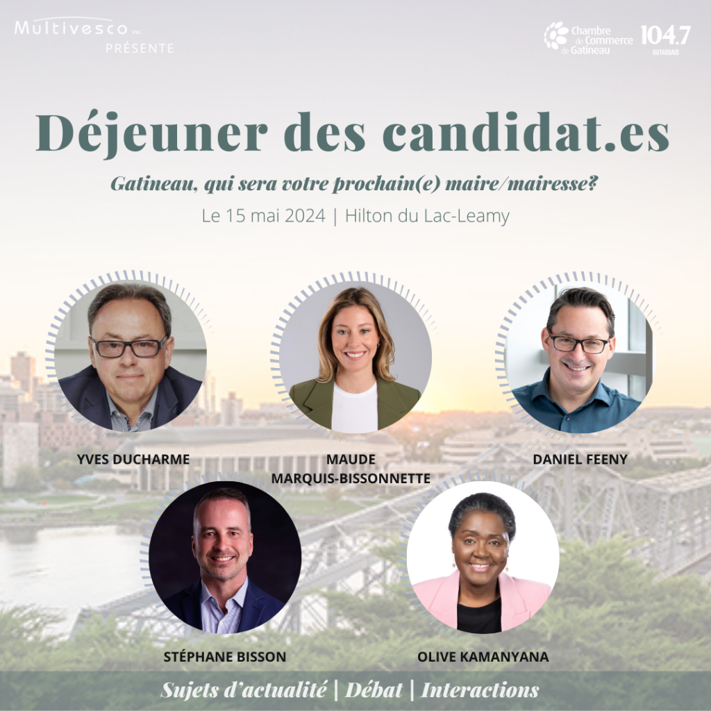 En anticipation de ce moment crucial pour notre ville, la Chambre de Commerce de Gatineau est fière d’annoncer la tenue du Déjeuner des Candidat.es, présenté par Multivesco en collaboration avec le 104.7 FM, un événement unique en son genre qui se tiendra le 15 mai prochain au Hilton du Lac-Leamy.